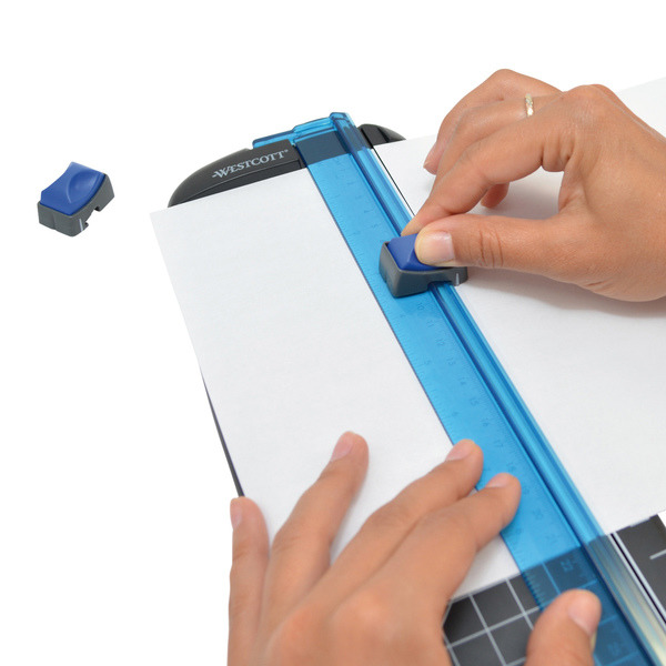 Multifunctioneel snijapparaat t/m 30 cm aanduiding met standaard en score snijmes. Uitvoering in blauw/zwart. Geleverd op blistercard.