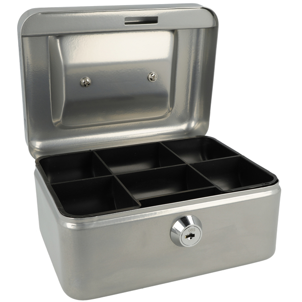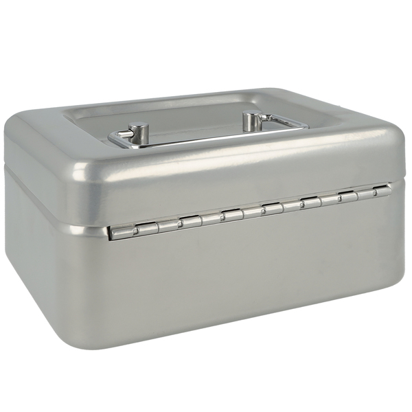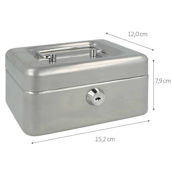 Met deze geldkist bergt u uw geld of waardevolle spullen veilig op. Deze geldkist gemaakt van staal wordt geleverd met 2 sleutels en heeft een kunststof inzet met 6 vakken voor munten. Doordat de geldkist een hangreep heeft die in de deksel valt kunt u de kist makkelijk opbergen. Afmeting: 152x120x79mm. Kleur: zilver.
