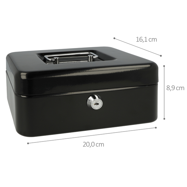 Met deze geldkist bergt u uw geld of waardevolle spullen veilig op. Deze geldkist gemaakt van staal wordt geleverd met 2 sleutels en heeft een kunststof inzet met 3 vakken voor munten. Doordat de geldkist een hangreep heeft die in de deksel valt kunt u de kist makkelijk opbergen. Afmeting: 200x161x89mm. Kleur: zwart.
