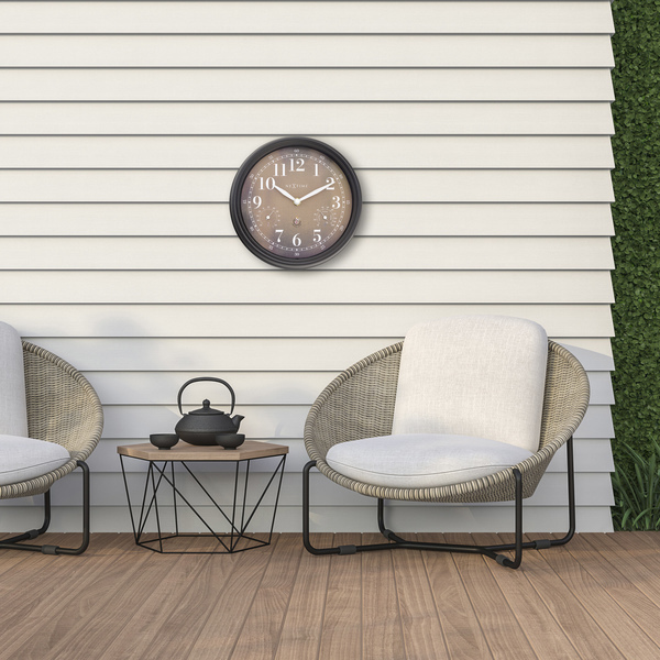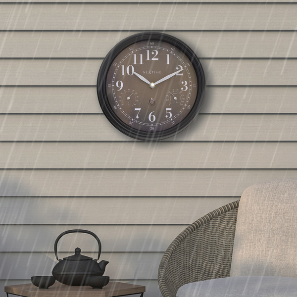 DeNeXtime NE-4318BR buitenklok Jasmine verteld meer dan alleen de tijd. Deze wandklok heeft namelijk ook een thermometer op de index welke de temperatuur in Celsius weergeeft en geeft de luchtvochtigheid aan. Deze klok heeft subtiele zwarte rand met een koperkleur gemeleerde wijzerplaat met een duidelijke witte cijfer en streep index. Het gebruik van extra rubberen ringen om te voorkomen dat het water de kwetsbare delen van de klok bereikt, maakt deze klok bijzonder en weerbestendig. De klok is geschikt voor zowel binnen als buiten en werkt op 1x AA-batterij (niet inbegrepen). Diameter: 23,5 cm.