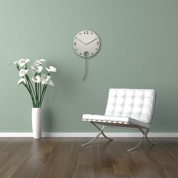 Deze wandklok combineert nieuwe ideeën en nieuwe materialen met speciale effecten. Deze klok heeft een bolle wijzerplaat van kunststof. Het pendulum is een ketting dat op het ritme van seconden onder de klok op en neer bungelt. De cijfers 3, 9 en 12 zijn uit de wijzerplaat gehaald en de overige uren worden aangeduid met stippen die eruit zijn gehaald. In plaats van het cijfer 6 is het pendulum zichtbaar.