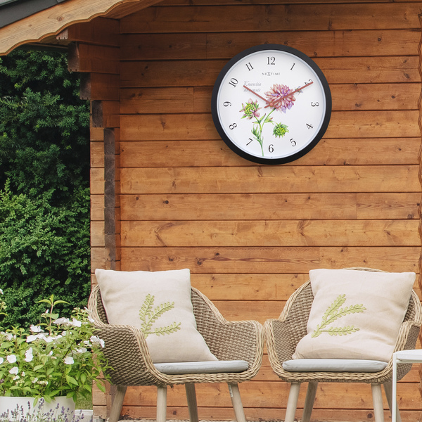 DeNeXtime NE-4317 buitenklok Knautia is niet alleen functioneel maar ook een feestje om naar te kijken. De witte wijzerplaat is voorzien van een vintage aquarel illustratie van kamperfoelie die pure liefde, zuiverheid en vrede symboliseren. Het gebruik van extra rubberen ringen om te voorkomen dat het water de kwetsbare delen van de klok bereikt, maakt deze klok bijzonder en weerbestendig. De klok is geschikt voor zowel binnen als buiten en werkt op 1x AA-batterij (niet inbegrepen). Kleur: zwart/wit. Diameter: 30,5 cm.