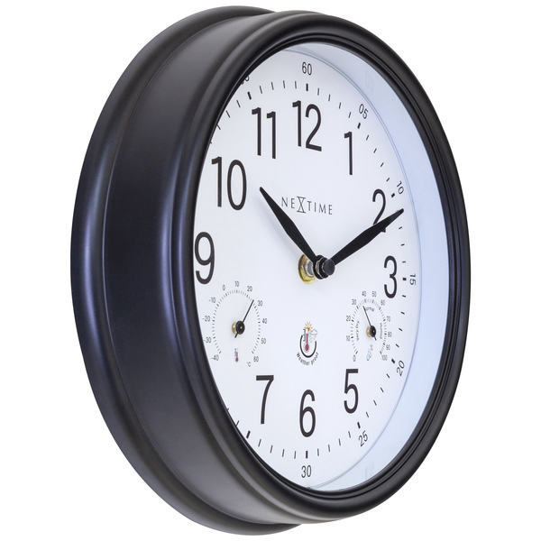 DeNeXtime NE-4318WI buitenklok Jasmine verteld meer dan alleen de tijd. Deze wandklok heeft namelijk ook een thermometer op de index welke de temperatuur in Celsius weergeeft en geeft de luchtvochtigheid aan. Deze klok heeft subtiele zwarte rand met een witte wijzerplaat met een duidelijke cijfer en streep index. Het gebruik van extra rubberen ringen om te voorkomen dat het water de kwetsbare delen van de klok bereikt, maakt deze klok bijzonder en weerbestendig. De klok is geschikt voor zowel binnen als buiten en werkt op 1x AA-batterij (niet inbegrepen). Diameter: 23,5 cm.