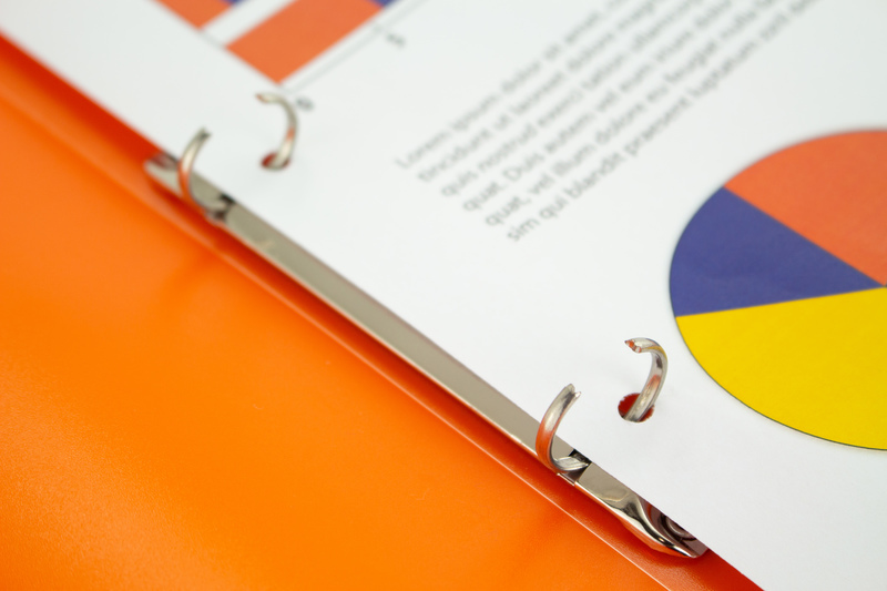Ringband 2-rings, A4 formaat. Vervaardigd van PP. Het 2-rings O-mechaniek heeft een capaciteit van 25 mm en is geklonken in de rug. Transparant oranje