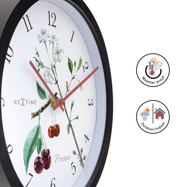 DeNeXtime NE-4314 buitenklok Prunus is niet alleen functioneel maar ook een feestje om naar te kijken. De witte wijzerplaat is voorzien van een vintage aquarel illustratie van kersenbloesems, die vitaliteit en kracht van de natuur symboliseren. Het gebruik van extra rubberen ringen om te voorkomen dat het water de kwetsbare delen van de klok bereikt, maakt deze klok bijzonder en weerbestendig. De klok is geschikt voor zowel binnen als buiten en werkt op 1x AA-batterij (niet inbegrepen). Kleur: zwart/wit. Diameter: 30, 5 cm.