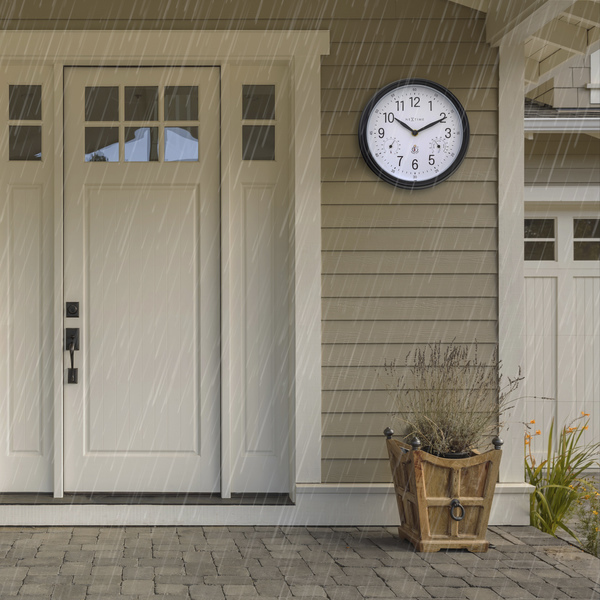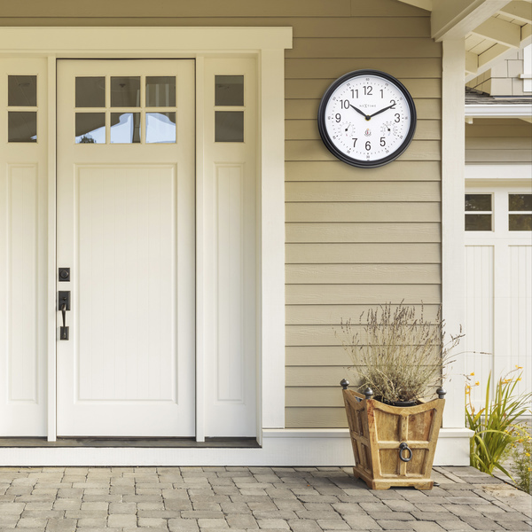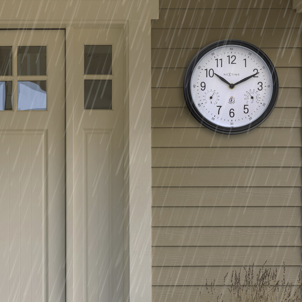 DeNeXtime NE-4318WI buitenklok Jasmine verteld meer dan alleen de tijd. Deze wandklok heeft namelijk ook een thermometer op de index welke de temperatuur in Celsius weergeeft en geeft de luchtvochtigheid aan. Deze klok heeft subtiele zwarte rand met een witte wijzerplaat met een duidelijke cijfer en streep index. Het gebruik van extra rubberen ringen om te voorkomen dat het water de kwetsbare delen van de klok bereikt, maakt deze klok bijzonder en weerbestendig. De klok is geschikt voor zowel binnen als buiten en werkt op 1x AA-batterij (niet inbegrepen). Diameter: 23,5 cm.