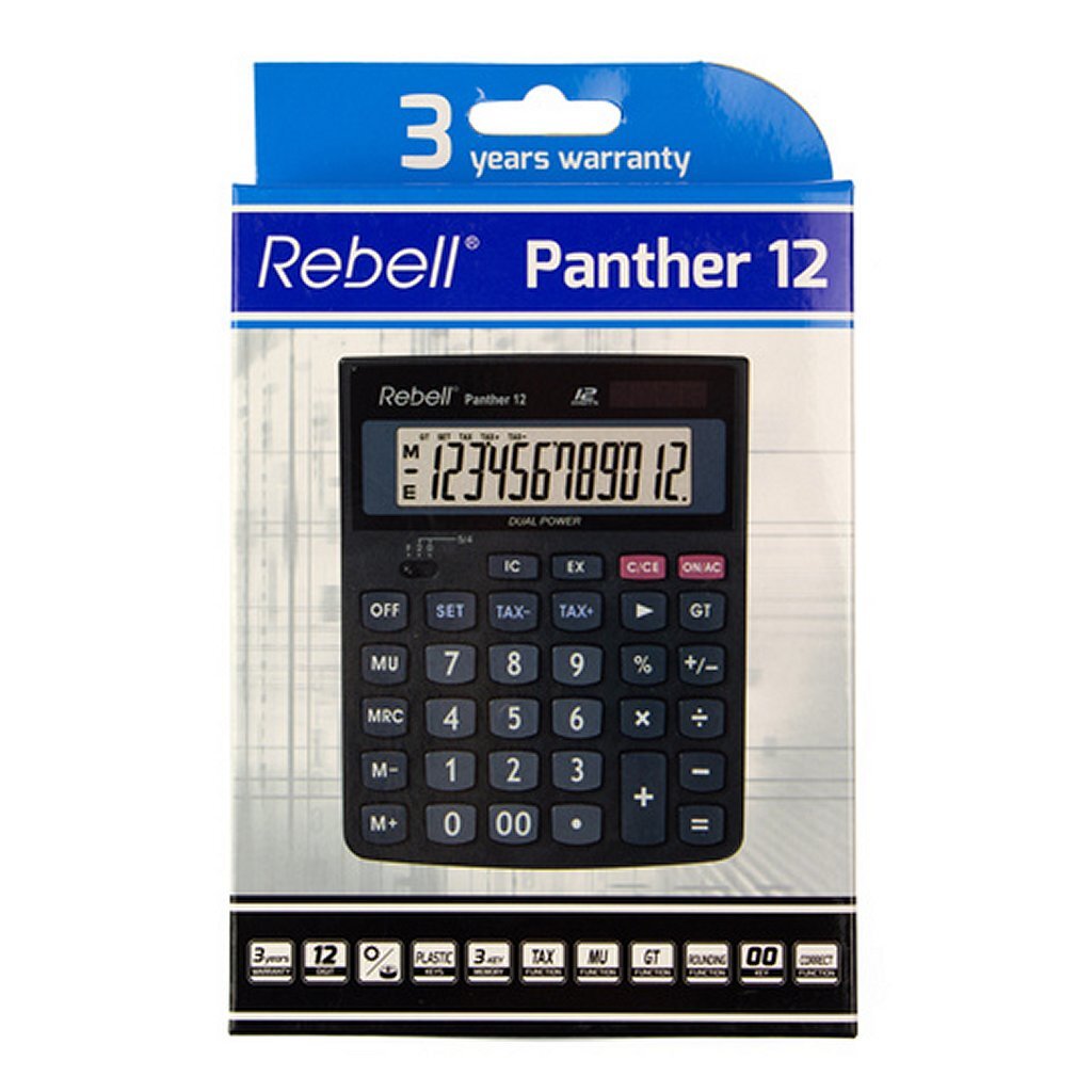 12-cijferige zwarte desktopcalculator met gekanteld display. Goed geplaatste plastic knoppen. Dubbele werking (zonne-energie en batterij). Toetsen procent 00,, +/, UIT. Geheugen met 3 knoppen. Belastingberekening (TAX+, TAX). MU-functie (Mark-Up). Totaal (functie GT). Afronding/decimale plaatskiezer (0,2,F). Artikelteller. EX-toets (mogelijkheid om de operants ten opzichte van de operator te wisselen). Correctietoets. Praktische rubberen voetjes voorkomen verschuiven. Gewicht: 126 g. Afmetingen: LxBxH 147 x 115 x 32 mm. Batterij: 1 x LR54.