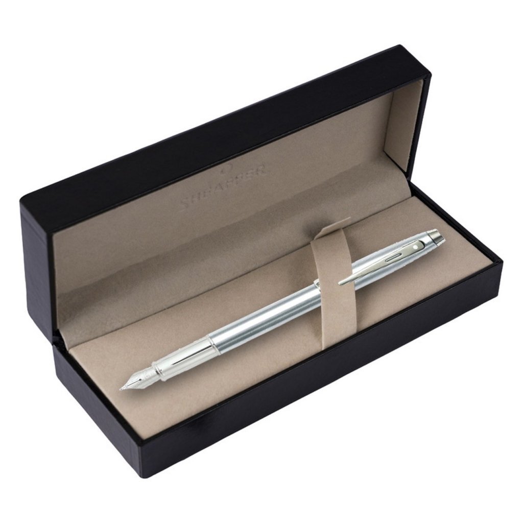 DeSheaffer SF-E0930653 vulpen 100 in geborsteld chroom met chroom gepolijste afwerking is voorzien van een medium penpunt M van roestvrij staal dat een nauwkeurig en betrouwbaar schrijfcomfort garandeert. Inclusief een Sheaffer converter die zelf gevuld kan worden. De populaire Sheaffer vulpen 100 met zijn moderne ontwerp en de subtiel uitgesneden clip, is een betaalbare manier om de schrijfervaring naar een hoger niveau te tillen en tegelijkertijd indruk te maken. De wereldwijd erkende witte Sheaffer stip, die symbool staat voor schrijfexcellentie, kwaliteit en prestige, is terug te vinden op de clip. De Sheaffer 100 pennen zijn beschikbaar als vulpen, rollerball en balpen in een breed scala van eigentijdse kleuren en worden geleverd in mooie geschenkdoos.