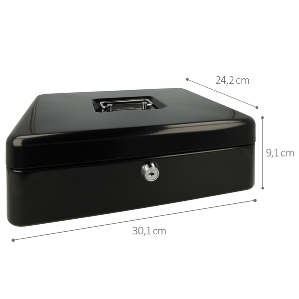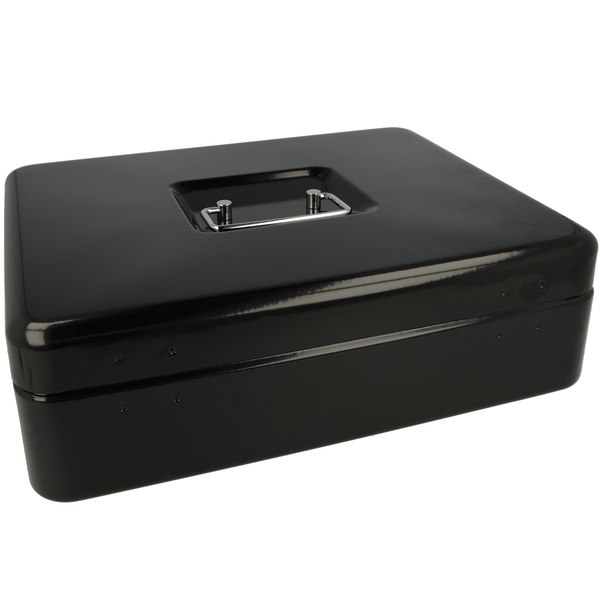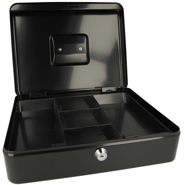 Met deze geldkist bergt u uw geld of waardevolle spullen veilig op. Deze geldkist gemaakt van staal wordt geleverd met 2 sleutels en heeft een kunststof inzet met 5 vakken voor munten. Doordat de geldkist een hangreep heeft die in de deksel valt kunt u de kist makkelijk opbergen. Afmeting: 301x242x91mm. Kleur: zwart.
