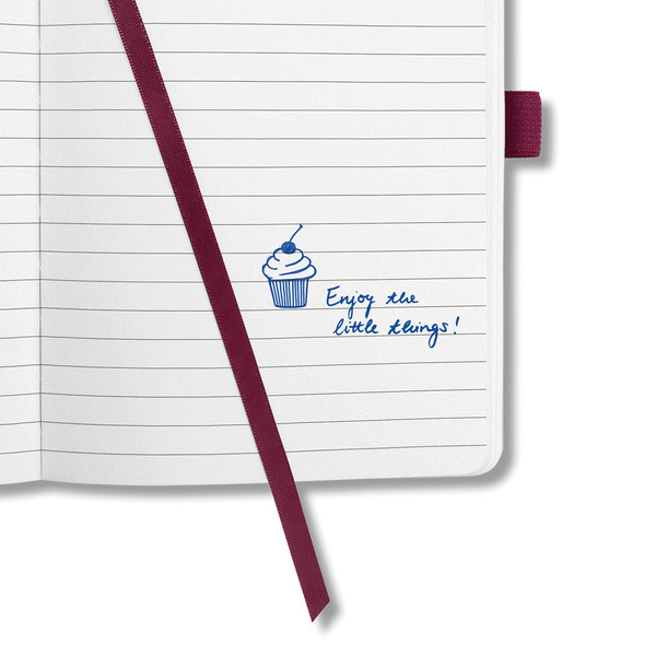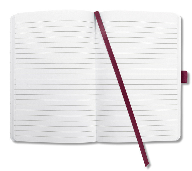 Notitieboek met wit gelinieerd papier, 80grs (zuurvrij, houtvrij en elementair chloorvrij). FSC gecertificeerd. 174 pagina's waarvan 16 geperforeerd. Het notitieboekje is voorzien van penlus, elastieksluiting, leeslint en opbergvak. De cover is gemaakt van zacht kunststof met een 3D effect en glanslak. Formaat A6: 95x150x16mm. Kleur roze.
